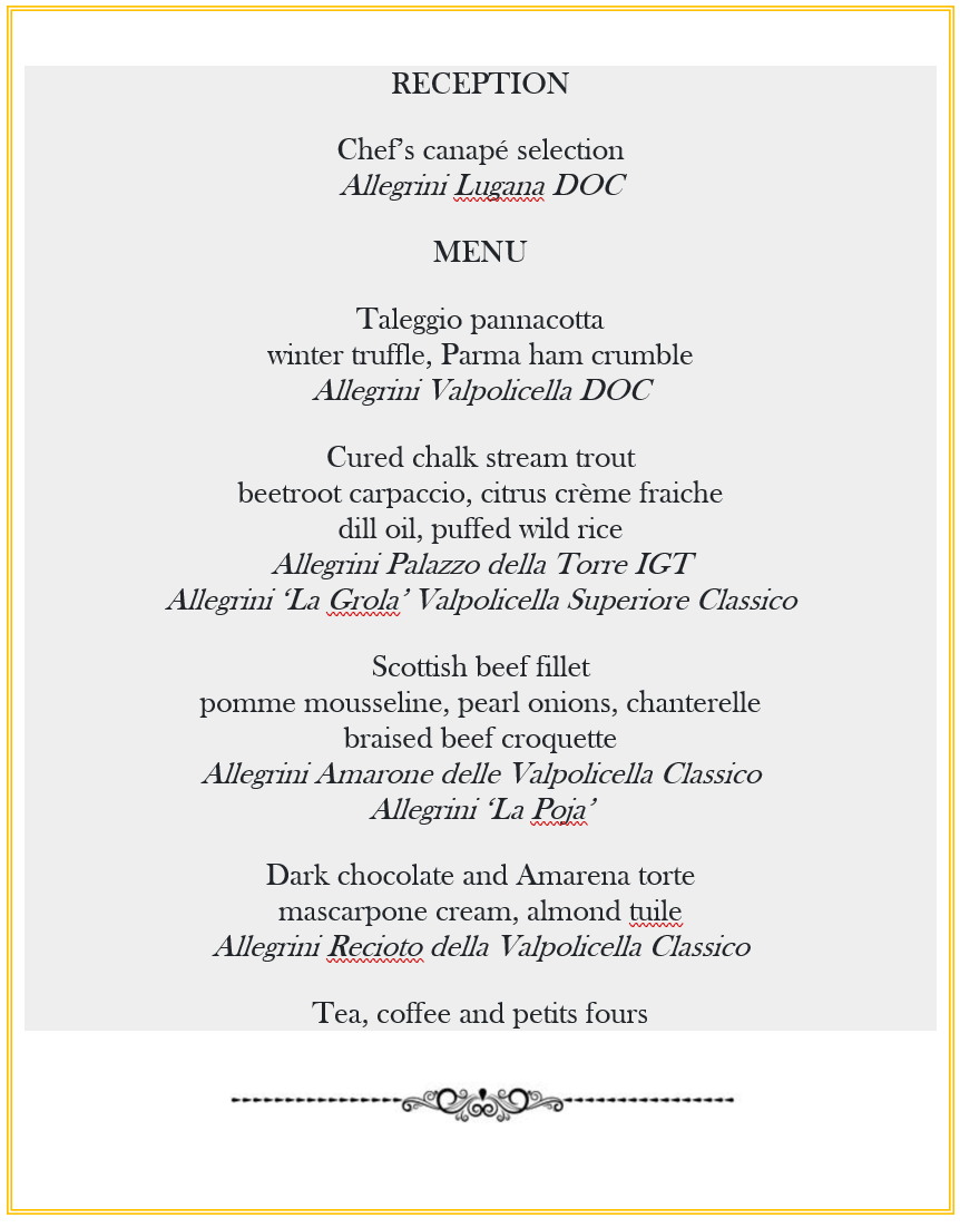 Host for the evening was Matteo Allegrini, the estate’s Oenologist and Export Director who guided members and guests at the reception and dinner through seven wines from the world famous Allegrini Estate in northern Veneto. Their top wines La Grola and La Poja are highly sought after, the latter being produced in limited quantities from the hilltop vineyard.